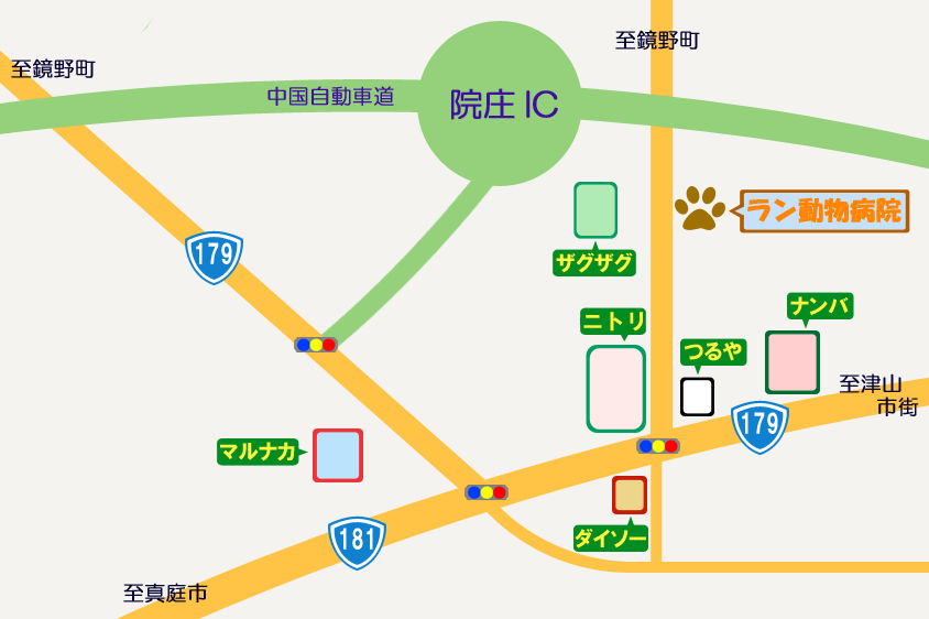 国道179号院庄インター南の戸島交差点を北へ約300m進んだ右手にあります