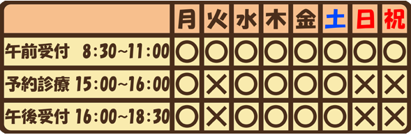 *受付終了間際の来院は手術の予約状況等によりお断りする場合がありますのでご了承ください。 休診:火・日・祝は午後休診(臨時休診にご注意ください) |